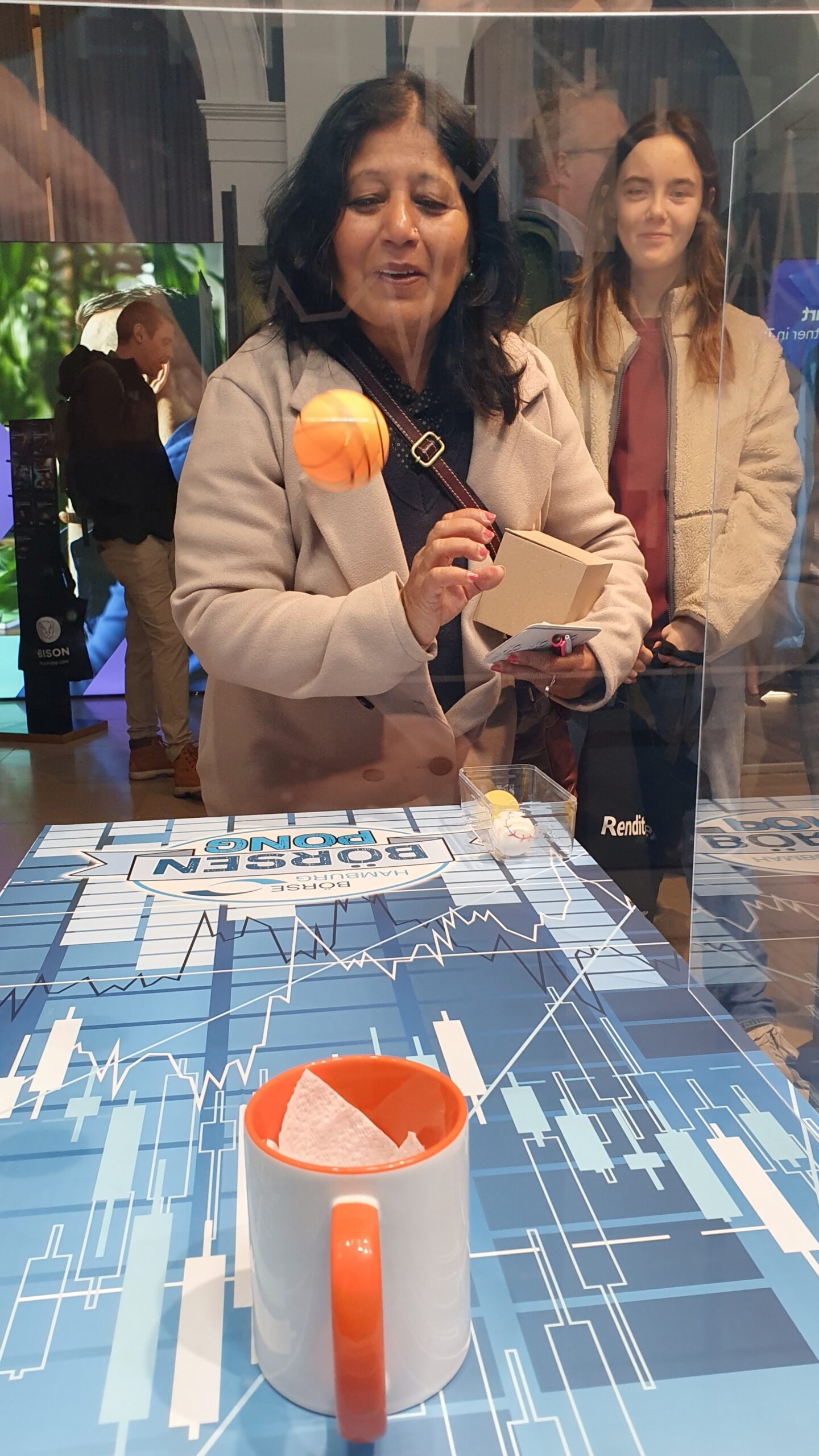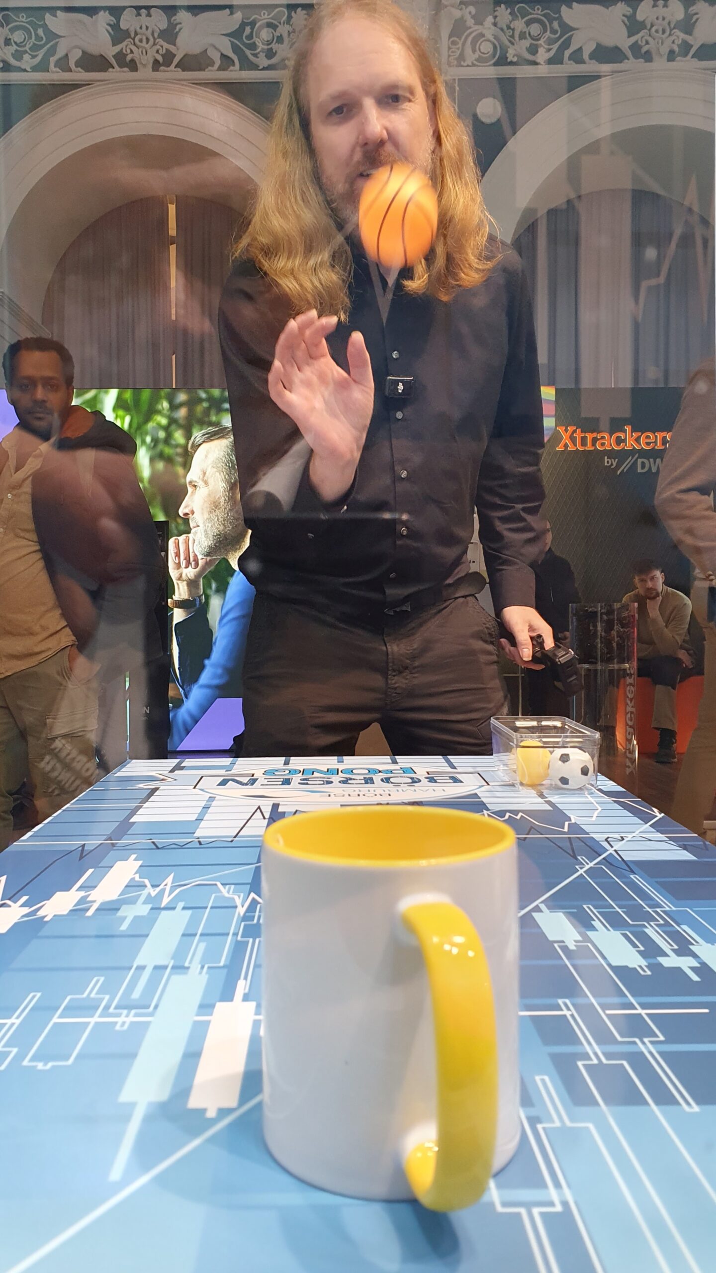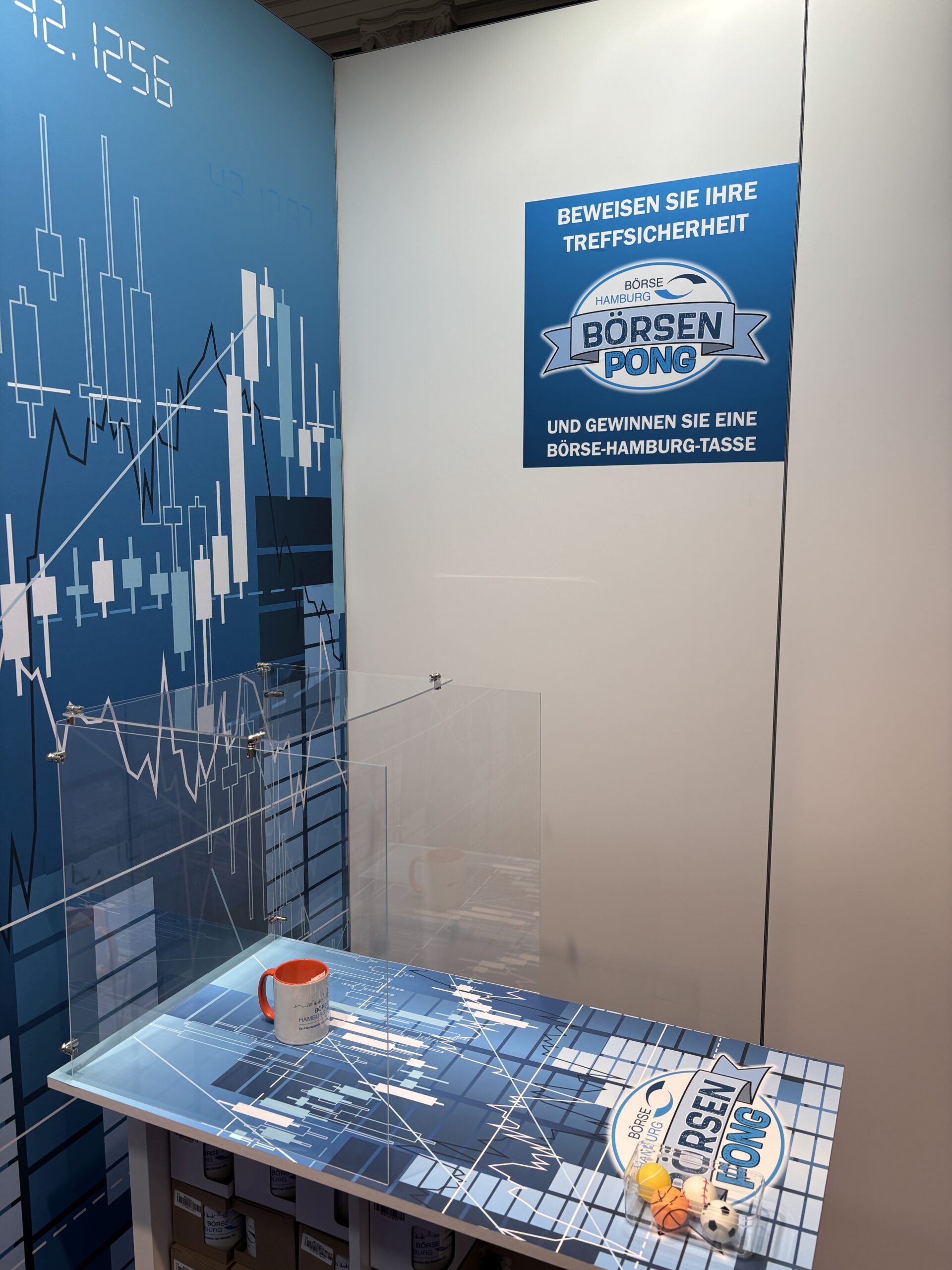 Als weiteres Highlight gab es am Stand der BÖAG in diesem Jahr das „Börsen Pong“. Ähnlich wie beim berühmt berüchtigten Bier-Pong-Spiel bestand das Ziel darin, per Wurf einen Tischtennisball in eine aufgestellte Börsen-Tasse zu platzieren. Ein erfolgreicher Treffer bedeutet hier gleichzeitig den Gewinn einer der bunten Börse-Hamburg-Tasse. Aber was einfach klingt, hat in der Praxis seine Tücken und sorgte für viel Spaß und Entertainment!